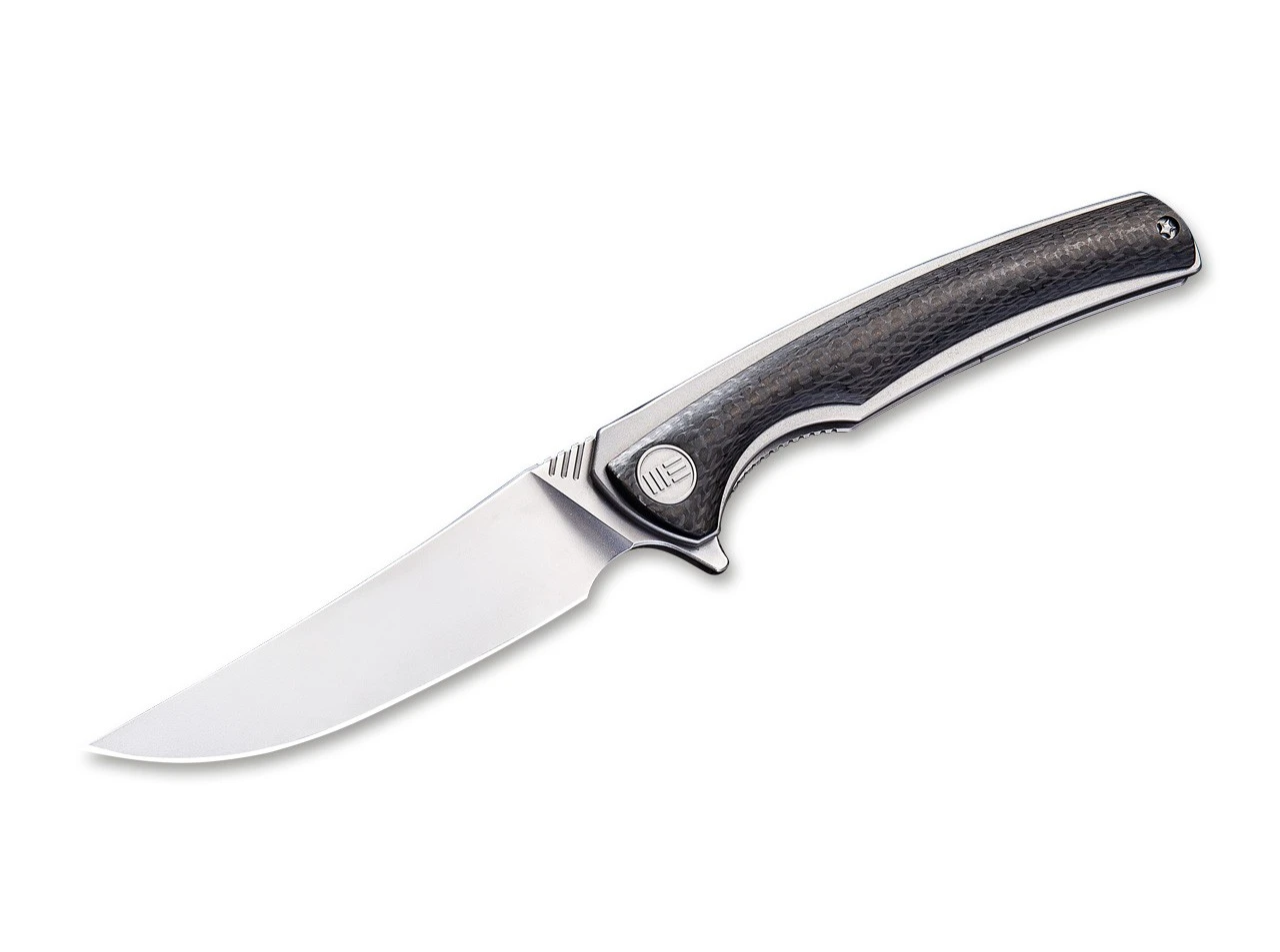Das 704CF-B von WE Knife ist mit Kohlefaser-Griffschalen über grauen Titanplatinen ausgestattet. Sein leichter Griff wird gepaart mit einer von Hand satinierten Böhler M390-Klinge. Der Einsatz eines Kugellagers bietet ein reibungsloses Öffnen für eine reaktionsschnelle und zuverlässige Einhandbedienung. Es ist mit einem Tip-up Titanclip ausgestattet.
