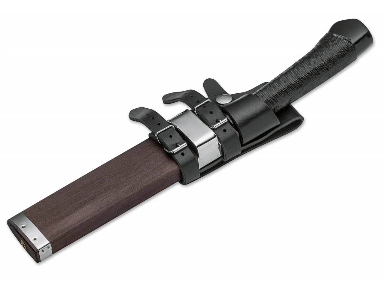 Yoshihiko Akimoto ist Messerschmied in der dritten Generation in Seki in Japan. Der Familienbetrieb Red Orca wurde von seinem Großvater Yoshiharu Akimoto (geb. 1896) gegründet und fertigt seitdem hochwertige geschmiedete Klingen für unterschiedliche Anwendungen. Das Ken-Nata ist als Universalwerkzeug für den Outdoorgebrauch konzipiert und fungiert als kleine Machete ebenso wie als größeres Camp- oder Jagdmesser. Ein Kern aus dem klassisch-japanischen Shirogami-2-Stahl (weißer Papierstahl, nicht rostfrei) wird mit weicheren Seitenlagen verschmiedet, um trotz der hohen Härte der Klinge Flexibilität und Belastbarkeit zu gewährleisten. Die Klinge des Ken-Nata ist ballig auf Null geschliffen, ohne separate Schneidfase. So paart sich exzellente Schärfe mit Stabilität. Der Griff und die Scheide sind traditionell aus Holz gefertigt. Während die Griffwicklung mit Kunstharz fixiert ist, besitzt die Scheide eine abnehmbare Leder-Gürtelschlaufe. Das Ken-Nata versteht sich also keineswegs als reines Vitrinen- oder Sammlerstück, sondern auch als hochwertiges Gebrauchsmesser, das die jahrhundertealte Schmiedekunst Japans auch in der Gegenwart auf das Lebendigste verkörpert.