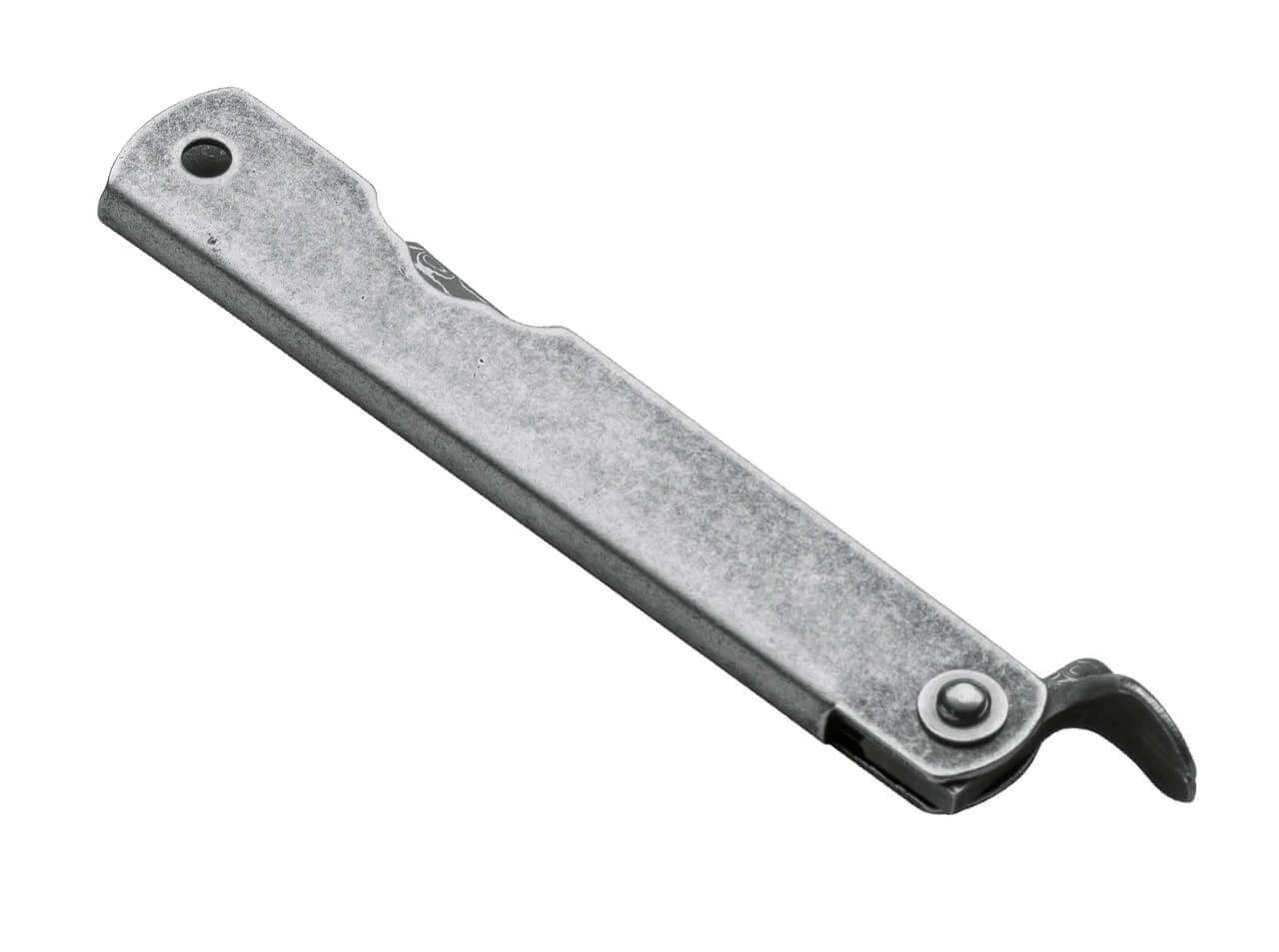 Der gefaltete Griff des Higo Kinzoku Damascus wird aus Edelstahl gefertigt und ist mit einer dezenten Fangriemenöse ausgestattet. Die schmale Klinge besteht aus hochwertigem Damast.