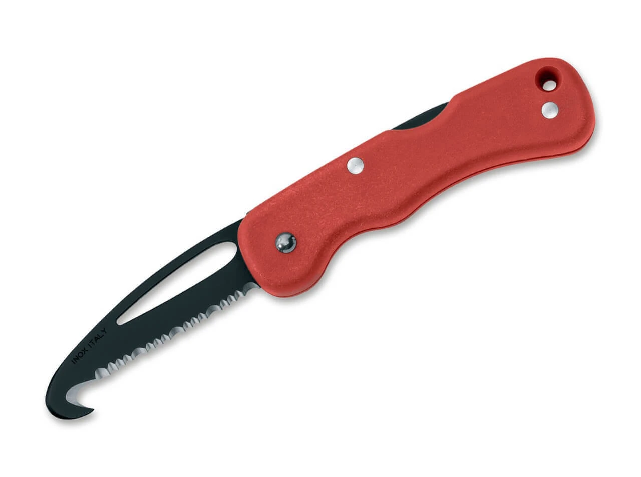 Das signalfarbene Rettungsmesser 697 von MAC ist mit einer Wellenschliff-Klinge aus 4034 ausgestattet. Sie öffnet per Daumenöffnung und verriegelt per Backlock. Die roten Griffschalen bestehen aus GFK. Zusätzlich lässt sich die gebogenen Klingenspitze als Gurtschneider nutzen.