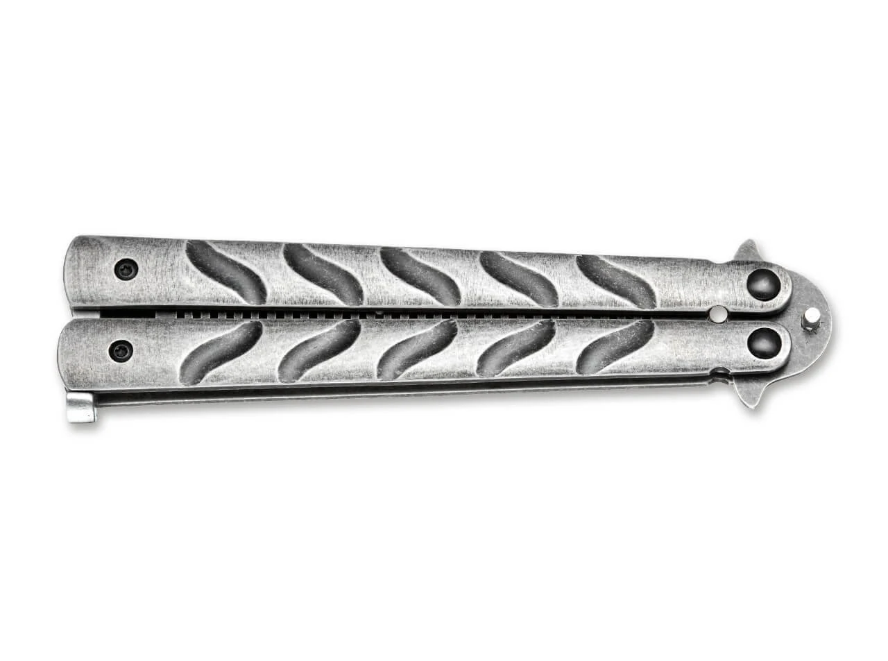 Auch als Kamm macht das ursprünglich aus Asien stammende Balisong eine überaus gute Figur. Sowohl der Kamm selbst als auch der zweigeteilte Griff bestehen aus Edelstahl und sind mit einem dunklen Stonewash-Finish versehen. Und so bekommt selbst das Nachziehen des Scheitels eine fast schon taktische Anmutung.