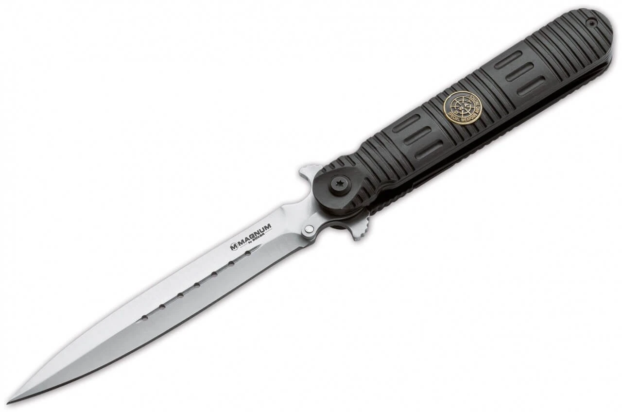 Das Magnum SWAT Transformer ist ein außergewöhnliches Messer, das mit einer schlanken Klinge aus rostfreiem 440A ausgestattet ist. Sie ist deutlich länger als das eigentliche Heft und wird von einem stabilen Linerlock sicher arretiert. Eine ausgeklügelte Technik erlaubt es, das Messer im eingeklappten Zustand trotz der ungewöhnlichen Proportionen sicher zu führen, da ein Klingenschutz beim Einklappen automatisch aus dem Griff herausfährt und die Spitze des Messers abdeckt. Der schwarz anodisierte Griff aus Aluminium trägt das SWAT-Emblem.