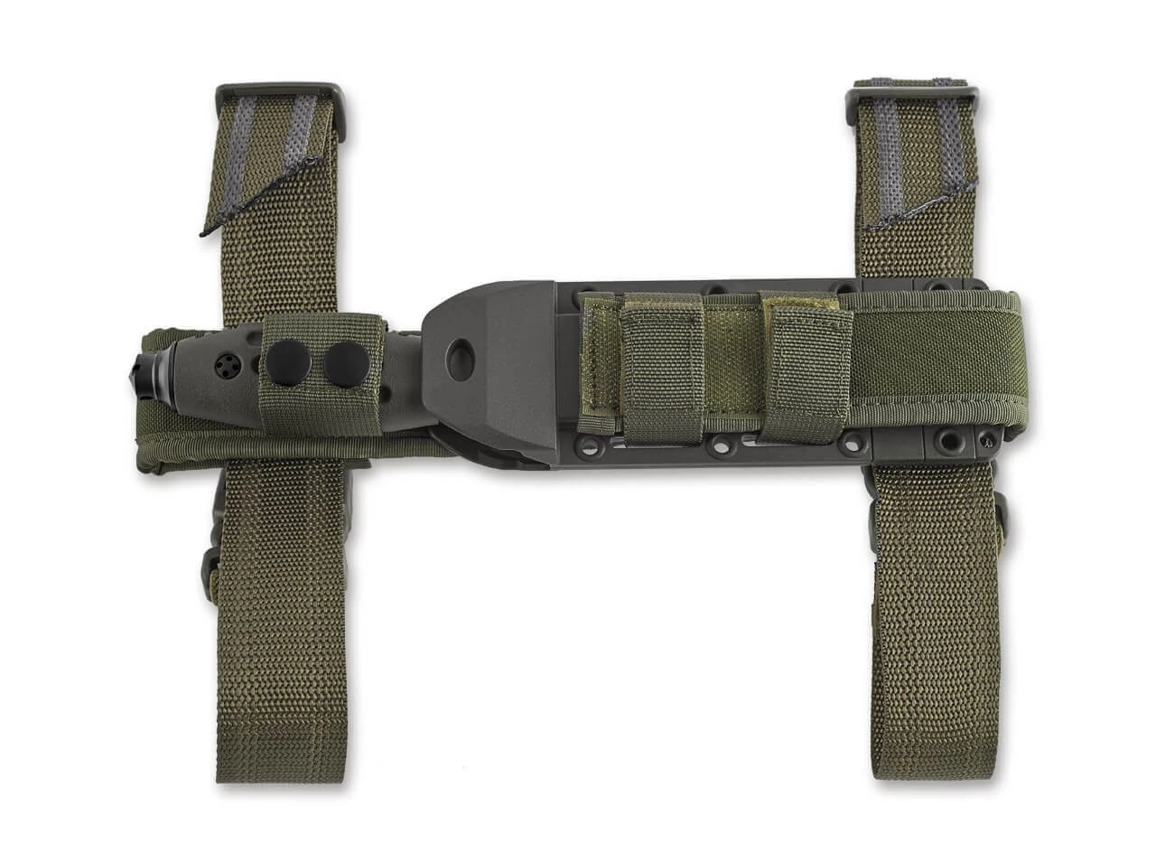 Die FKMD Sputnik Serie glänzt vor allem mit besonders hohem Gebrauchswert und einer extrem sicheren Handlage. Durch das grüne TPR Griffmaterial ist das Sputnik 11 auch bei Nässe oder Kälte sehr komfortabel und sicher zu handhaben, wozu die zahlreichen Mulden und Rillen ihren Teil beitragen. Das kleine integrierte Parierelement trägt ebenso eine Öse wie der Glasbrecher im Griffende, wodurch sich das feststehende Messer zum Beispiel auch an einem Stock festbinden lässt. Die satinierte Klinge aus N690 ist mit ihrer außergewöhnlichen Stärke von 5mm optimal dimensioniert, um Schneidpotential und Stabilität zu vereinen. Die Fehlschärfe der Drop-Point Klinge unterstreicht den taktischen Charakter des Einsatzmessers. Die äußerst funktionale symmetrische Scheide ist aus GFK gefertigt und sitzt in einem Molle-kompatiblen Nylonhalter mit Gürtelschlaufe und abnehmbaren Beingurten.