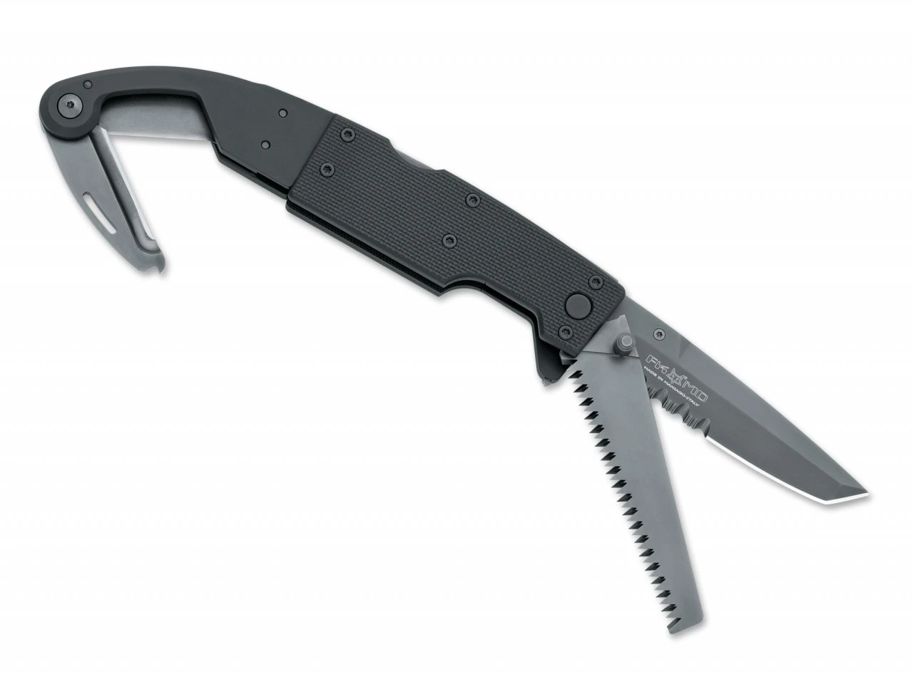 Das Allzweckmesser der Luftstreitkräfte ist mit einer NSN-Nummer (NATO Stock Number) versehen und bietet neben der Tantoklinge mit Teilwellenschliff eine Säge sowie eine zusätzliche ausklappbare Kappklinge zum gefahrlosen und schnellen Durchtrennen von Seilen, Gurten, Netzen und so weiter. Aluminiumgriff mit G10-Beschalung, Klingen PVD-beschichtet. Konzipiert als Notfall- und Survivalmesser bietet das T.M.A.M. maximale Funktion bei minimalem Packmaß. Lieferung in Sammlerschatulle mit italienischem Hoheitsabzeichen und einem Textilabzeichen, sowie einem Ansteckemblem der Einheit. Lieferung mit stabilem Nylonetui. NSN: 5110-15-193-2722